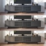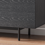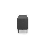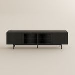 Mobile TV Mid-Century moderno, console multimediale minimalista nera con ante dell'armadietto a doghe in legno